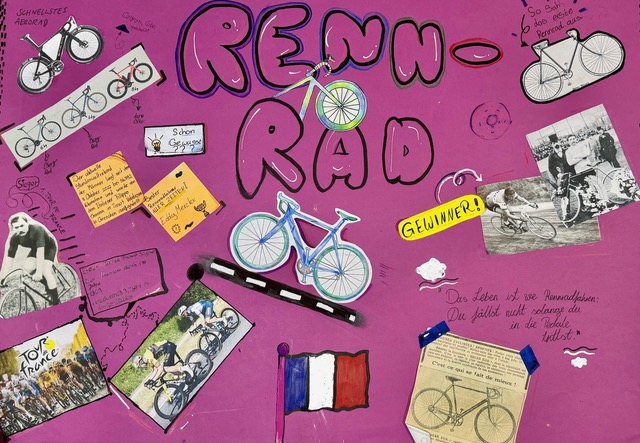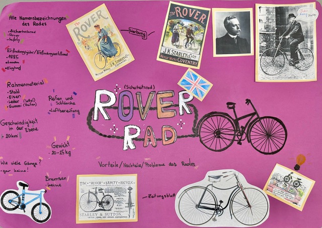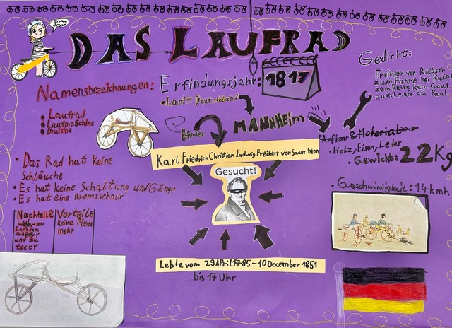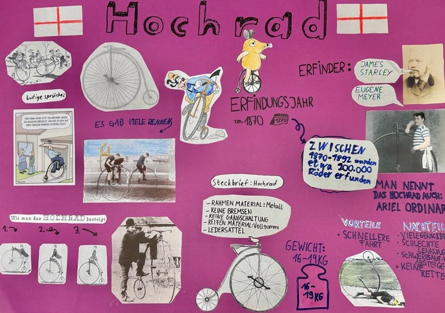 Die sechs Fahrradtypen wurden den Gruppen zugelost: Laufrad, Tretkurbelrad, Hochrad, Sicherheitsrad, Rennrad und Mountainbike.Jede Gruppe musste interessante Informationen zu ihrem Radtyp recherchieren und auf einem Plakat zusammenfassen.Die sehenswerten Plakate sind im folgenden zu sehen.